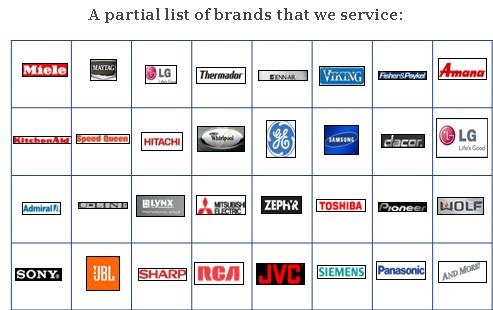 Washer, Dyer, Refrigerator, Freezer, Dishwasher, Microwave, Oven, Range, Exhaust fans, trash compactors, Rear Projection TV; Plasma TV; LCD TV; LCD Projection; DLP TV; Front Projectors; Televisions; Monitors; LED TV; Audio Equipment; Laptops; Computer ... And much more... Whether you need help to setup your new audio/video system, or any repairs for an appliance or electronics device, we offer a service to fit your needs.